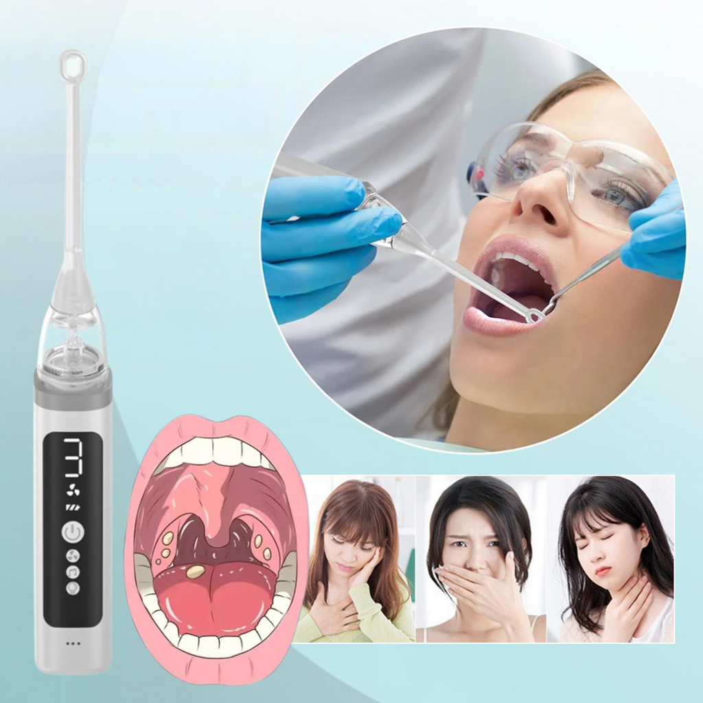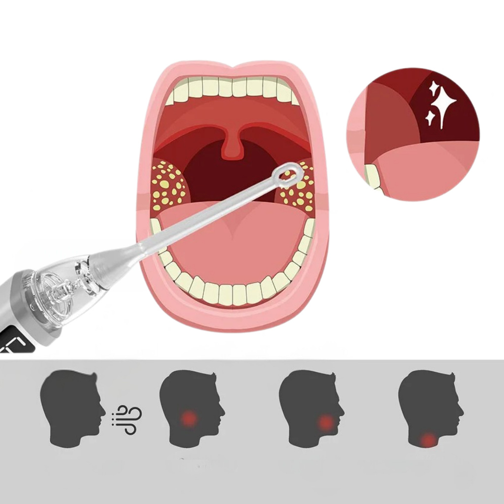 Quickly and painlessly remove tonsil stones from the comfort of your own home with this ergonomic device made of medical-grade silicone. Its gentle, three-level suction technology effectively removes bothersome deposits while respecting the sensitivity of the mucous membranes, and the integrated LED provides precise guidance for safe cleaning. Supplied with five interchangeable tips to suit every need, it offers a complete, hygienic, and comfortable solution to combat bad breath and restore a healthy throat in minutes. All this in a portable and rechargeable design, for simple and convenient everyday use.