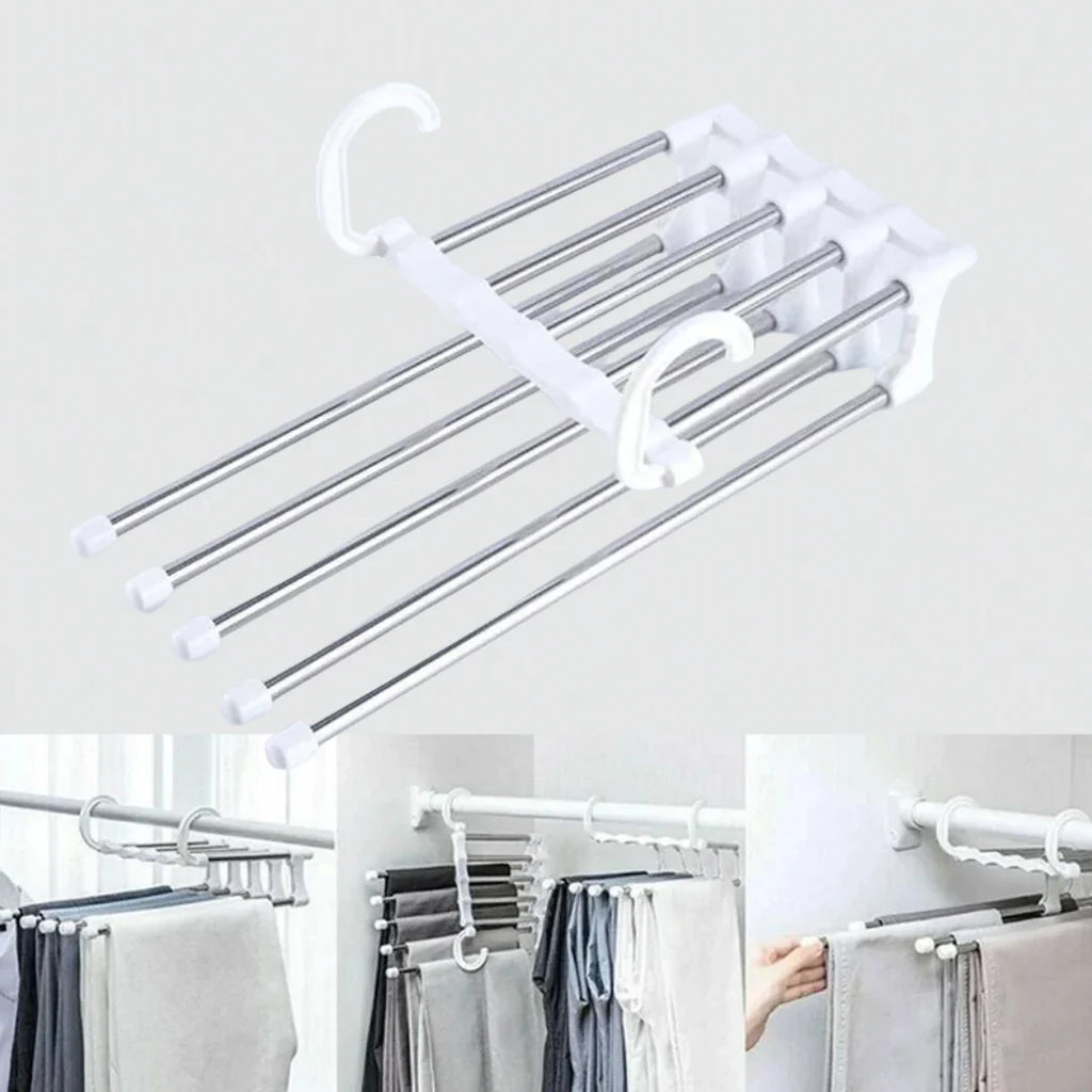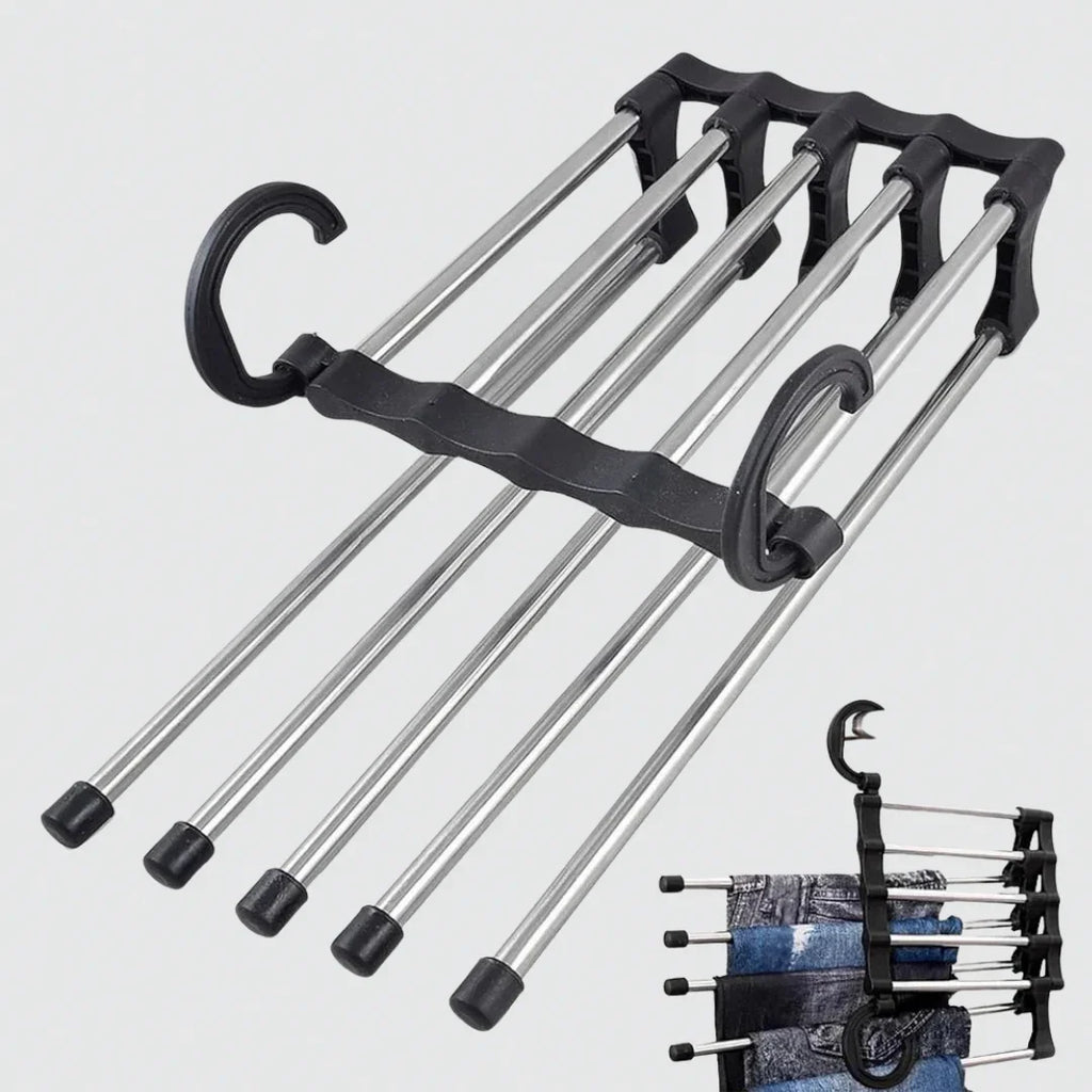 Optimisez l’espace de votre dressing avec ce cintre ingénieux capable de suspendre jusqu’à cinq pantalons à la fois. Compact, robuste et pliable, il s’adapte à tous les types de vêtements et à toutes les armoires. Parfait pour un rangement organisé, gain de place et sans plis, que ce soit à la maison ou en voyage.